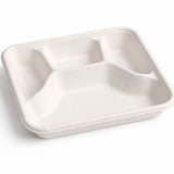 حافظة طعام مقسّمة إلى أربعة أقسام، مصنوعة من ألياف قصب السكر الطبيعية، صديقة للبيئة، مع إمكانية إضافة غطاء، مناسبة للوجبات المتنوعة مع الحفاظ على فصل الأصناف، مثالية للمطاعم وخدمات الإعاشة.