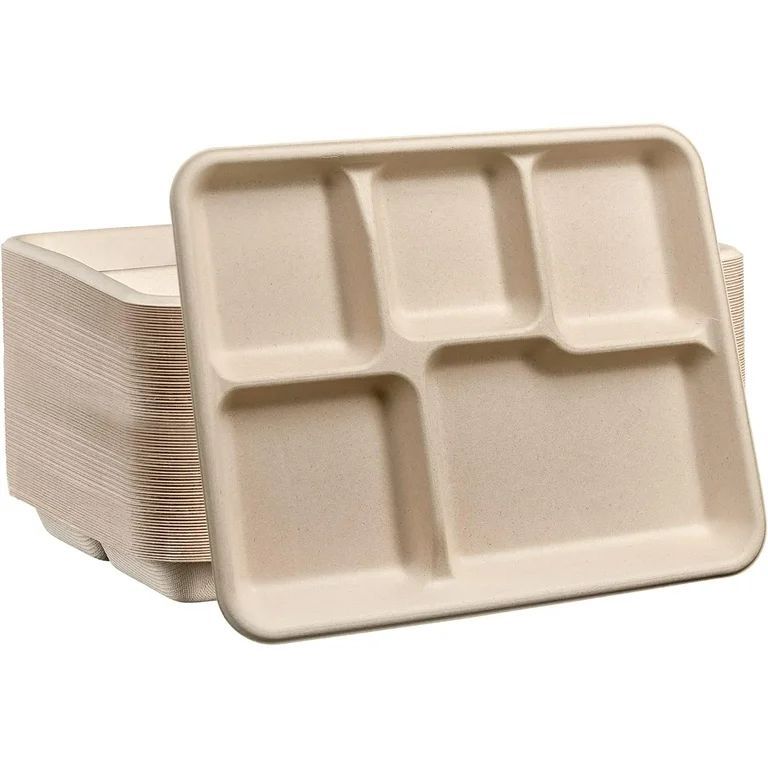 صحن مقسّم إلى خمس خانات، مصنوع من ألياف قصب السكر، صديق للبيئة، مناسب لتقديم الوجبات المتنوعة مع الحفاظ على الفصل بين الأصناف، مثالي للمطاعم وخدمات الإعاشة، مع إمكانية طباعة الشعار حسب الطلب.